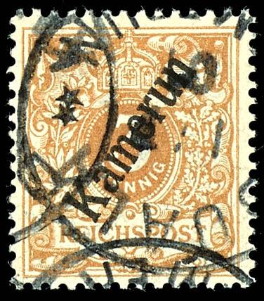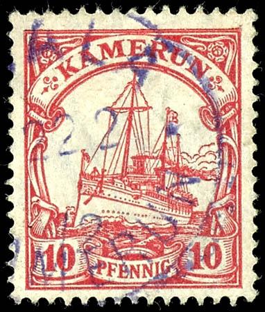 10 pfennigs crown / eagle dark rose red (UV yellowish orange fluorescent) with black typography overprint \Cameroon\, unused, expertized Jaeschke L. BPP, Michel 300.- (3c) 10 Pfennig Krone/Adler dunkelrosarot (UV gelblichorange quarzend) mit schwarzem Bdr.-Aufdruck \Kamerun\, ungebraucht, geprüft Jäschke-L. BPP, Mi. 300.- (Image)