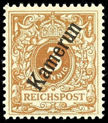 3 pfennigs crown / eagle pale ocher with black typography overprint \Cameroon\, perfectly mint never hinged and still unsigned, photo expertize Michael Jaeschke Lantelme BPP \well perforated and in faultless, mint never hinged condition. \ Michel 500.- (1e) Certificate 3 Pfennig Krone/Adler hellocker mit schwarzem Bdr.-Aufdruck \Kamerun\, tadellos postfrisch und noch unsigniert, Fotoattest Michael Jäschke-Lantelme BPP \gut gezähnt und in fehlerfreier, postfrischer Erhaltung.\ Mi. 500.- (Image)