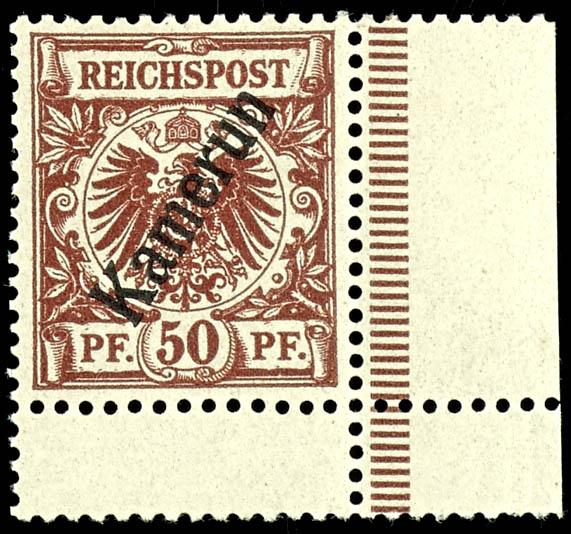 50 pfennigs crown / eagle with overprint \Cameroon\, margin copy with gutter extension, mint never hinged, sound, Michel 70.- plus plus (6) 50 Pfennig Krone/Adler mit Aufdruck \Kamerun\, Randstück mit Zwischenstegansatz, postfrisch, tadellos, Mi. 70.-++ (Image)