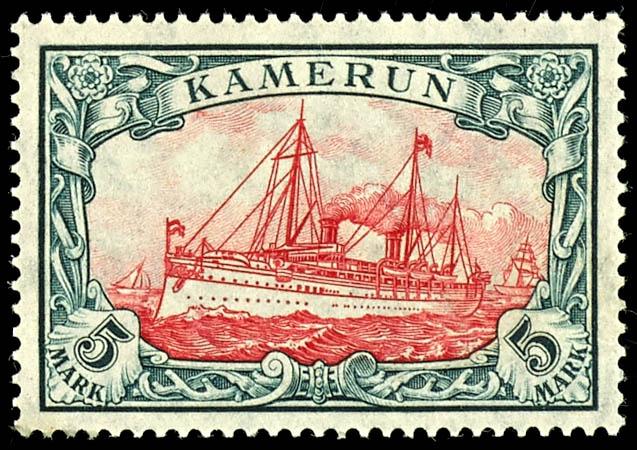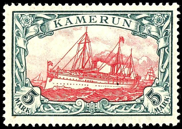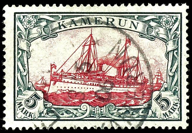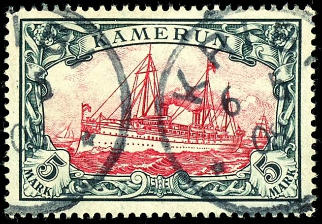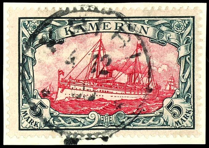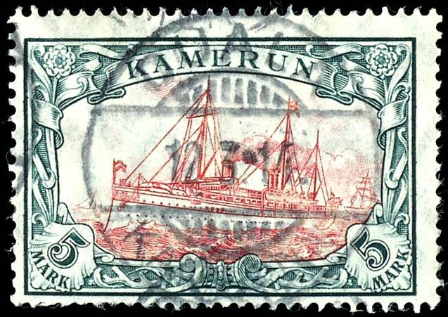 5 Mark imperial yacht, neat cancelled, \DUALA 5.8.10\, photo expertize Steuer BPP. \genuine and faultless\, Michel 600.- (19) Certificate 5 Mark Kaiseryacht, tadellos gestempelt, \DUALA 5.8.10\, Fotoattest Steuer BPP. \echt und fehlerfrei\, Michel 600.- (Image)