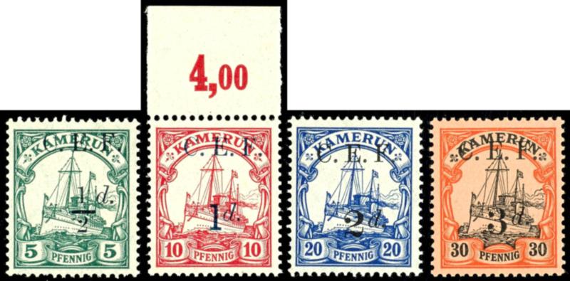 5, 10, 20 and 30 pfennigs imperial yacht with overprint \C. E. F. \ and new indication of currency, mint never hinged, sound, without signature, Michel 110.- (2,3a,4,6) 5, 10, 20 und 30 Pfennig Kaiseryacht mit Aufdruck \C.E.F.\ und neuer Währungsangabe, postfrisch, tadellos, ohne Signatur, Mi. 110.- (Image)