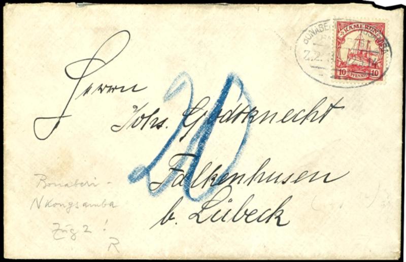 BONABERI-NKONGSAMBA railway mail ZUG 2, on beautiful letter with 10 pfennigs \imperial yacht\, sender from Njombe (North train), in Germany with postage due allocated, rare (22) BONABERI-NKONGSAMBA BAHNPOST ZUG 2, auf schönem Brief mit 10 Pfennig \Kaiseryacht\, Absender aus Njombe (Nordbahn), in Deutschland mit Nachporto belegt, selten (Image)