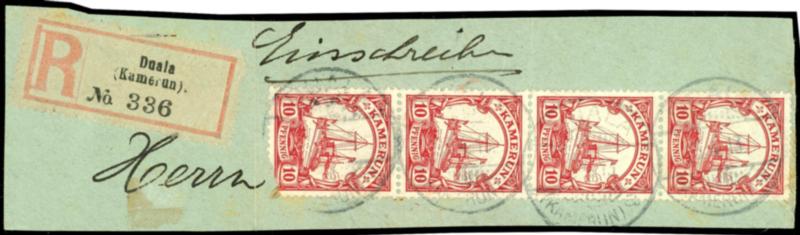 DUALA a, four times central mounted on piece with vertical strip of four 10 pfennigs and belonging registered label, rare (22) DUALA a, viermal zentral abgeschlagen auf Briefstück mit senkrechtem Viererstreifen 10 Pfennig und zugehörigem R- Zettel, selten (Image)