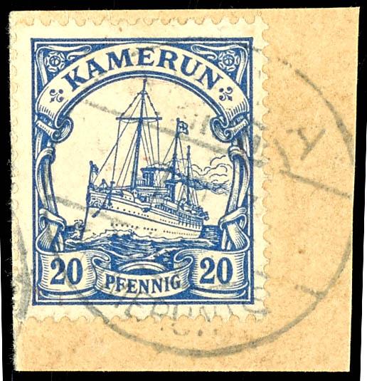 DUALA a, central strike on piece with 20 pfennigs imperial yacht, sound, photo expertize Michael Jaeschke Lantelme BPP (10) Certificate DUALA a, zentraler Abschlag auf Briefstück mit 20 Pfennig Kaiseryacht, tadellos, Fotobefund Michael Jäschke-Lantelme BPP (Image)
