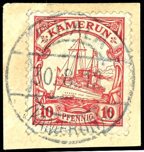 DUALA b, complete strike on piece with 10 pfennigs \imperial yacht\, sound, twice signed Bothe BPP (22) DUALA b, vollständiger Abschlag auf Briefstück mit 10 Pfennig \Kaiseryacht\, tadellos, doppelt geprüft Bothe BPP (Image)