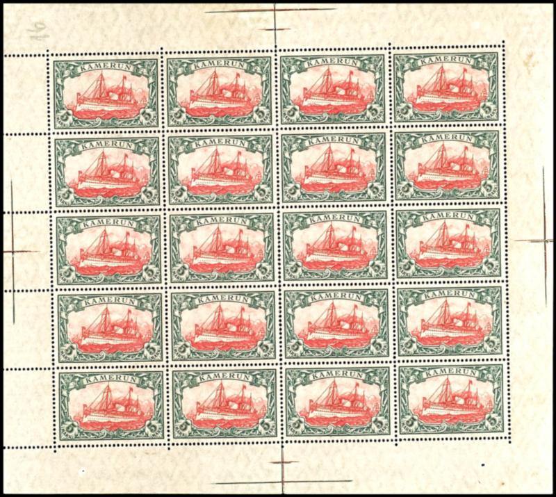 2 Mark imperial yacht, counter sheet of 20 each values, upper margin of sheet marker cross on margin to facilitate cutting or perforating of panes with plate number 4 and left with marker cross on margin to facilitate cutting or perforating of panes and printing number 2, lower right printer signature (semicircle), mint never hinged, very fine (17(20)) 2 Mark Kaiseryacht, Schalterbogen zu 20 Werten, oberer Bogenrand Passerkreuz mit Plattennummer 4 und links mit Passerkreuz und Formnummer 2, unten rechts Druckerzeichen (Halbkreis), postfrisch, tadellose Erhaltung (Image)