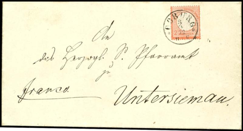 2 Kreuzer small breast shield, fresh colours, excellent embossed and perforated, as usual centered on cover \COBURG 3.9.72\ in the characteristic place delivery area to Untersiemau, perfect neat cancelled with still used Tu T single circle cancel, complete folded letter with full content, sound. (8) 2 Kreuzer kleiner Schild, farbfrisch, sehr gut geprägt und gezähnt, üblich zentriert auf Brief \COBURG 3.9.72\ im eigenen Ortszustellbezirk nach Untersiemau, ideal klar gestempelt mit nachverwendetem TuT-K1, kompletter Faltbrief mit vollem Inhalt, tadellos. (Image)
