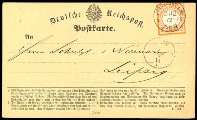 2 Kreuzer small breast shield, orange, properly franked single franking on card (official postcard form Impudent number 20 II) from \Frankfurt A. M. N2.2 / 12 72\ to Leipzig, sound, photo expertize Hansmichael Krug BPP, Michel 400.- (15) Certificate 2 Kreuzer kleiner Schild, orange, portogerechte Einzelfrankatur auf Karte (amtliches Postkartenformular Frech Nr. 20II) von \Frankfurt A. M. N2. 2/12 72\ nach Leipzig, tadellos, Fotobefund Hansmichael Krug BPP, Mi. 400.- (Image)