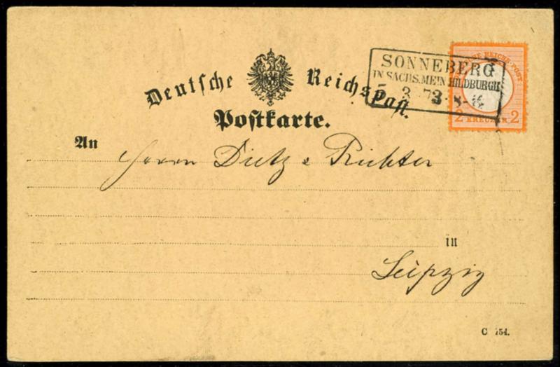 2 Kreuzer small breast shield, orange, properly franked single franking on card (official postcard form Impudent number 32 I) from SONNBERG / IN SACHS. my. HILDBURGH / 5 3 73\ to Leipzig, at the bottom two short perfs otherwise pristine, photo expertize Hansmichael Krug BPP, Michel 400.- (15) Certificate 2 Kreuzer kleiner Schild, orange, portogerechte Einzelfrankatur auf Karte (amtliches Postkartenformular Frech Nr. 32I) von SONNBERG / IN SACHS. MEIN. HILDBURGH / 5 3 73\ nach Leipzig, unten zwei kurze Zähne sonst tadellos, Fotobefund Hansmichael Krug BPP, Mi. 400.- (Image)