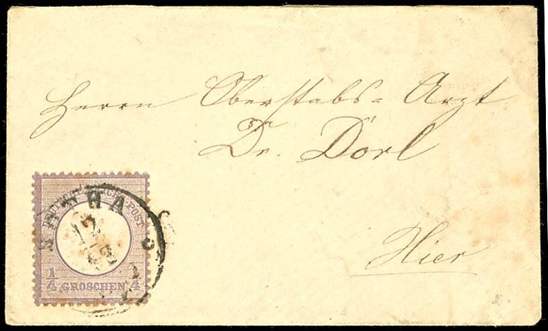 1 / 4 Groschen large shield, gray violet, single franking on local letter with cancellation \GOTHA 12 12 11-12 V\, old shadings, properly franked single franking, photo expertize Hansmichael Krug BPP (2025) \single frankings the 1 / 4 Gr. stamps are not common. \, Michel 650.- (16) Certificate 1/4 Groschen großer Schild, grauviolett, Einzelfrankatur auf Ortsbrief mit Entwertung \GOTHA 12 12 11-12V\, Alterstönungen, portogerechte Einzelfrankatur, Fotoattest Hansmichael Krug BPP (2025) \Einzelfrankaturen der 1/4 Gr.-Marken sind nicht häufig.\, Mi. 650.- (Image)