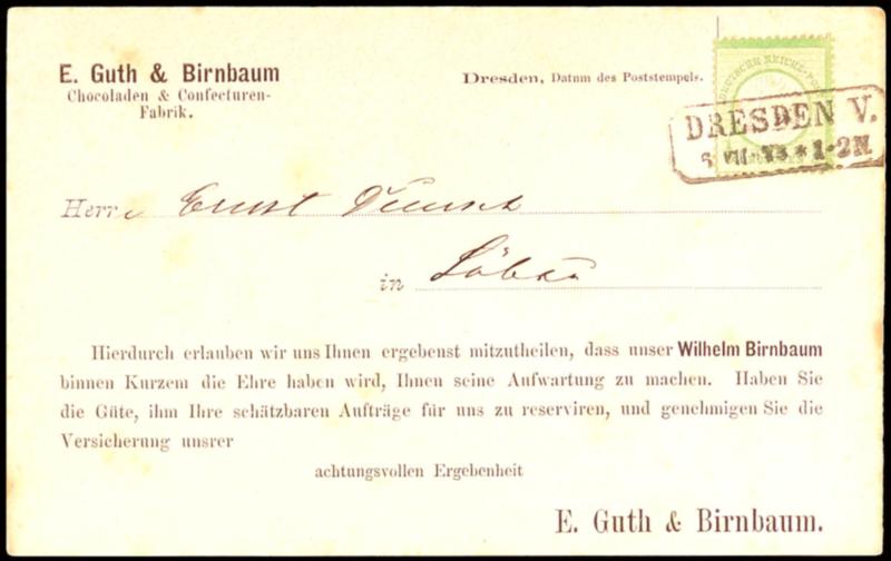 1 / 3 Groschen large shield, yellowish green, as properly franked single franking on representative postcard a Chocolaten & Confecturen Factory from Dresden, with Saxony framed cancel of 3 lines \DRESDEN V. 6. VII. 73\ to Loebau, small brown dots, expertized at best Krug BPP (17a) 1/3 Groschen Großer Schild, gelblichgrün, als portorichtige Einzelfrankatur auf Vertreter-Postkarte einer Chocolaten & Confecturen-Fabrik aus Dresden, mit Sachsen-Ra3 \DRESDEN V. 6.VII.73\ nach Löbau, kleine Braunpunkte, bestens geprüft Krug BPP (Image)