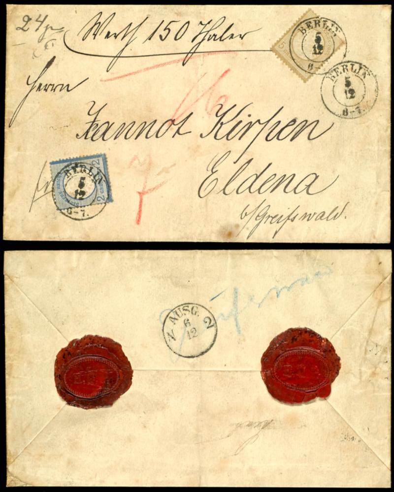 2 Groschen and 5 Groschen large shield on reverse sealed insured letter from BERLIN to Eldena (Greifswald) with arrival postmark (20,22) 2 Groschen und 5 Groschen großer Schild auf rückseitig gesiegeltem Wertbrief von BERLIN nach Eldena (Greifswald) mit Ankunftsstempel (Image)