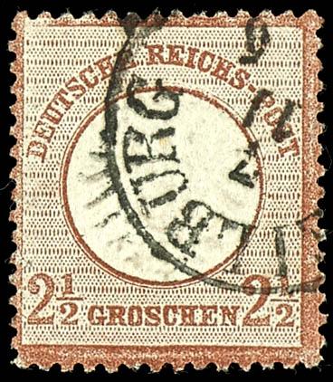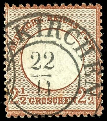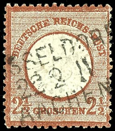 2 1 / 2 Groschen great breast shield medium red brown, centric cancellation with still used Prussia two ring cancel \ODENKIRCHEN 22 / 11\, faultless, superb in every respect (choice copy), photo expertize Krug BPP \the stamp is in the typically shade the better b-colour, fresh colours, good embossed, well perforated and in perfect condition. \, Michel 700.- (21b) Certificate 2 1/2 Groschen Großer Brustschild mittelrotbraun, zentrisch gestempelt mit nachverwendetem Preußen-K2 \ODENKIRCHEN 22/11\, tadellos erhalten, Kabinett, Fotoattest Krug BPP \Die Marke ist in der typischen Nuance der besseren b-Farbe, farbfrisch, gut geprägt, gut gezähnt und in einwandfreier Erhaltung.\, Mi. 700.- (Image)