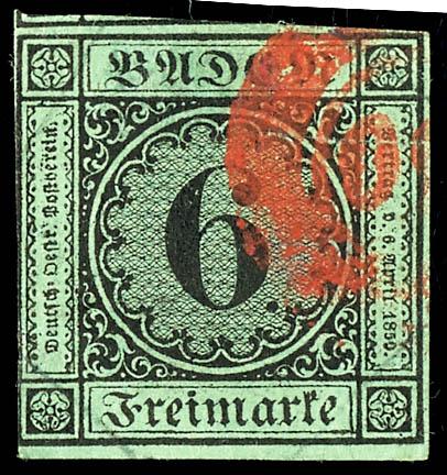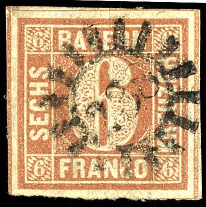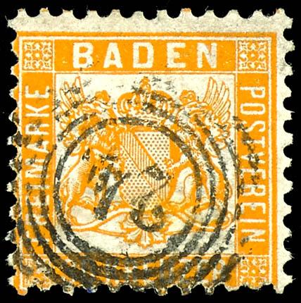 30 Kreuzer dark yellowish-orange, complete and fresh cabinet piece, centrally cancelled with a spiked wreath stamp \24\ (Carlsruhe), a rare stamp in this quality, examined by Richter and photo certificate Franz Stegmueller BPP (2023) \Fresh color and fine, flawless condition. A decorative example.\, Michel 3. 000.- (22b) Certificate 30 Kreuzer dunkelgelblichorange, vollzähniges und farbfrisches Kabinettstück, zentrisch entwertet mit Zackenkranzstempel \24\ (Carlsruhe), in dieser Qualität eine seltene Marke, geprüft Richter und Fotoattest Franz Stegmüller BPP (2023) \Farbfrische und feine, tadellose Erhaltung. Ein dekoratives Exemplar.\, Mi. 3.000.- (Image)