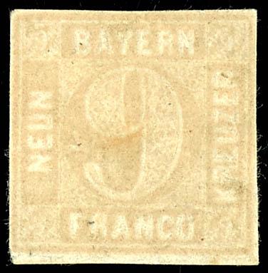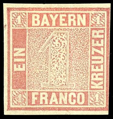 1 Kreuzer carmine red (instead of black) on white paper, Plate 1, mint never hinged, color proof - slightly touched at the bottom right, delicate paper wrinkle, photo certificate Peter Sem BPP \Color proofs of the first German postage stamp are rare. They were apparently only produced in small quantities. The present example is in excellent condition.\ ex. Collection Dr. Stenger (starting price 2000) (1P1) Certificate 1 Kreuzer karminrosa (statt schwarz) auf weißem Papier, Platte 1, ungummiert, Farbprobe - rechts unten leicht berührt, zarter Papierknitter, Fotoattest Peter Sem BPP \Farbproben der ersten deutschen Briefmarke sind selten. Sie wurden offenbar nur in geringer Stückzahl angefertigt. Das vorliegende Exemplar ist frisch erhalten.\ ex. Sammlung Dr. Stenger (alter Ausruf 2000) (Image)