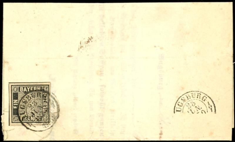 1 Kreuzer black, Plate 1, a fresh and well-margined cabinet piece, cut all around, as a single franking on a printed matter (visiting card) with cancellation \AUGSBURG 23 JUN 1850 11-12.\, without address panel, photo certificate Franz Stegmueller BPP (2025) \Below the stamp, part of the original wrapper is still visible. Clear strike and fine, flawless condition. The printed matter was later refolded. A fresh and original entire piece.\, Michel 7,000.- (1Ia) Certificate 1 Kreuzer schwarz, Platte 1, allseits sehr breitrandig geschnittenes und farbfrisches Kabinettstück als Einzelfrankatur auf Drucksache (Besuchsanzeige) mit Entwertung \AUGSBURG 23 JUN 1850 11-12.\, ohne Adressschleife, Fotoattest Franz Stegmüller BPP (2025) \Unterhalb der Marke befindet sich noch ein Teil des ursprünglichen Streifbandes. Klare Abstempelung und feine, tadellose Erhaltung. Die Drucksache wurde nachträglich umgefaltet. Ein farbfrisches und ursprüngliches Ganzstück.\, Mi. 7.000.- (Image)