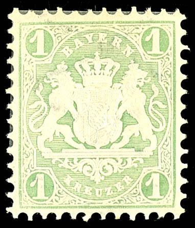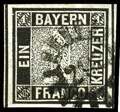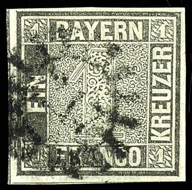 1 Kreuzer black, Plate 2, fine-perforated and mint never hinged cabinet piece with interlinear markings on the left and bottom, cancelled with a closed wheel stamp \217\ Munich, unsigned, photo certificate Maria Brettl BPP \in excellent condition.\ (1IIa) Certificate 1 Kreuzer schwarz Platte 2, vollrandiges und farbfrisches Kabinettstück mit Zwischenlinien links und unten, entwertet mit geschlossenem Mühlradstempel \217\ München, unsigniert, Fotoattest Maria Brettl BPP \in tadelloser Erhaltung.\ (Image)