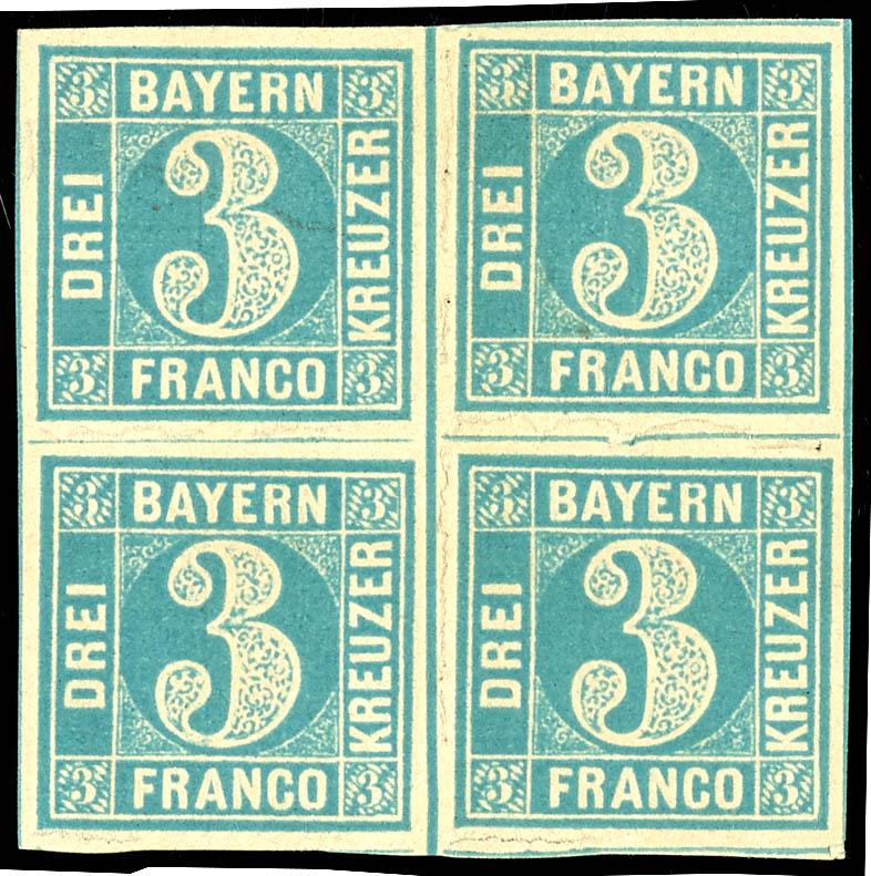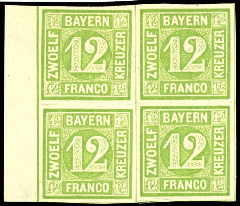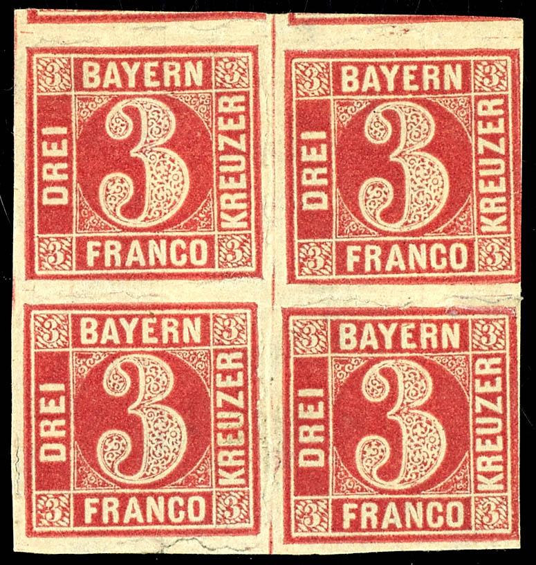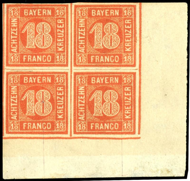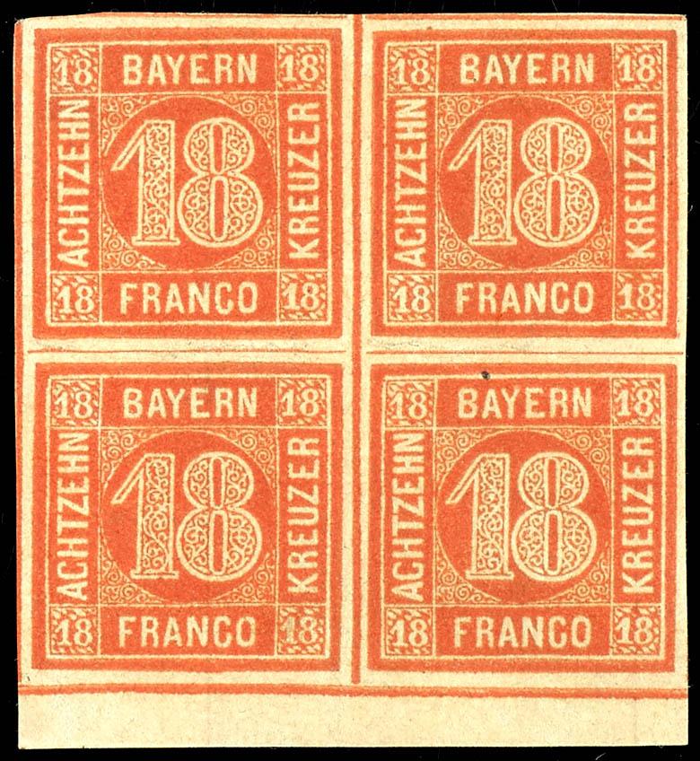 18 Kreuzer orange-red, block of four from the lower margin, full margin and fresh condition cabinet piece, mint never hinged with original gum, slightly bavarian brittle - not a defect but manufacturing-typical authenticity features, unsigned, photo certificate Peter Sem BPP \Perfectly preserved.\, Michel 1. 100.- (13b(4)) Certificate 18 Kreuzer orangerot, Viererblock vom Unterrand, vollrandiges und farbfrisches Kabinettstück, ungebraucht mit Originalgummierung, leicht bayernbrüchig - kein Mangel sondern herstellungstypische Echtheitsmerkmale, unsigniert, Fotoattest Peter Sem BPP \Tadellos erhalten.\, Mi. 1.100.- (Image)
