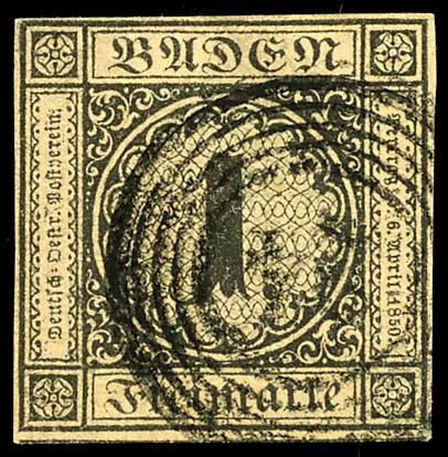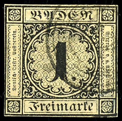 1 Kreuzer black on laid paper, full margin and fresh, above-average cabinet piece, clearly struck with the number postmark \24\ - Karlsruhe. Photographic finding by Franz Stegmueller BPP: \genuine and flawless\, rare in this condition! (1b) Certificate 1 Kreuzer schwarz auf sämisch, vollrandiges und farbfrisches, überdurchschnittliches Kabinettstück, klar gestempelt mit Nummernstempel \24\ - Karlsruhe, Fotobefund Franz Stegmüller BPP \echt und einwandfrei\, in diesem Schnitt selten! (Image)