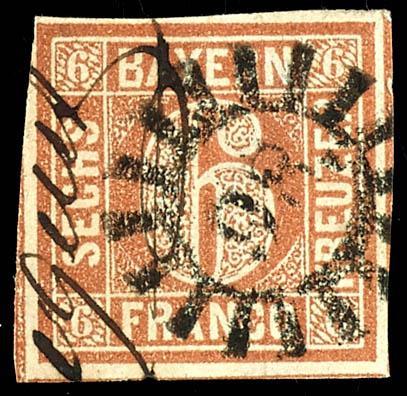 6 Kreuzer brown, Type I, used with a wheel stamp \98\ and an additional pen stroke cancellation, superb, Michel 200.- (4I) 6 Kreuzer braun, Type I, entwertet mit Mühlrad-Stempel \98\ und zusätzlichem Federzugentwertung, Pracht, Mi. 200.- (Image)