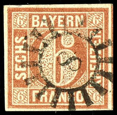6 reddish-brown Kreuzer, good Type I, fully to broadly margined, fresh and fine cabinet piece, cancelled with closed mill wheel postmark \8\ Amberg. (4I) 6 Kreuzer rötlichbraun in guter Type I, voll- bis breitrandig geschnittenes und farbfrisches Kabinettstück, entwertet mit geschlossenem Mühlradstempel \8\ Amberg (Image)