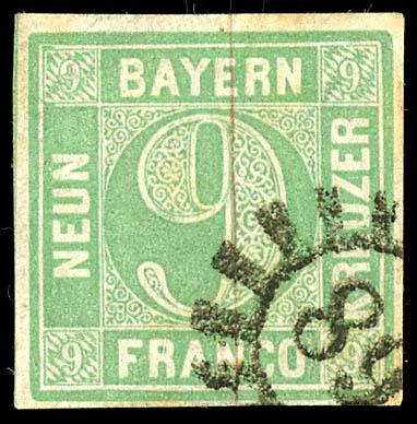 9 Kreuzer light olive green, Type III, with full to wide margins all around, with a partial strike of the closed wheel stamp \89\ - FRANKENTHAL, in very good, fresh condition, double signed Brettl, Michel 1,000.- (5bIII) 9 Kreuzer hellolivgrün, Type III, ringsum voll- bis breitrandig mit Teilabschlag des geschlossenem Mühlradstempel \89\ - FRANKENTHAL in sehr guter, farbfrischer Erhaltung, doppelt sign. Brettl, Mi. 1.000.- (Image)