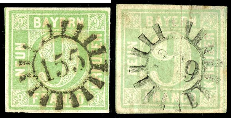 9 Kreuzer matte blue-green (Mi number 5 aa) and 9 Kreuzer light emerald green (Mi number 5 a), both Type IIII, full margin and fresh example, cancelled with a closed wheel postmark, expertized by Brettl, Michel 200.- (5aaIII/5aIII) 9 Kreuzer mattblaugrün (MiNr. 5aa) und 9 Kreuzer hellsmaragdgrün (MiNr. 5a), jeweils in Type IIII, vollrandiges und farbfrisches Exemplar, entwertet mit geschlossenem Mühlradstempel, geprüft Brettl, Mi. 200.- (Image)