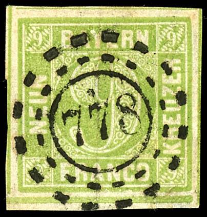 9 Kreuzer, bright yellowish-green, Plate III, four-margined on all sides, cancelled with an open wheel postmark \778\ Lindenberg, excellent condition. (5dIII) 9 Kreuzer, lebhaftgelbgrün, Platte III, allseits vollrandig, entwertet mit offenem Mühlradstempel \778\ Lindenberg, tadellose Erhaltung (Image)