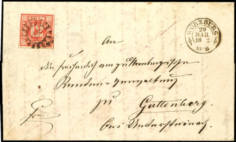 12 Kreuzer red, fine-margined and fresh mint cabinet piece on a letter from \538\ WUERZBURG with an adjacent local postmark K2 \WUERZBURG 29 MAER\ to the prominent address \zu Guttenberg\, reverse side with circular postmark UNTERSTEINACH 29 3 as arrival postmark. (6) 12 Kreuzer rot, vollrandiges und farbfrisches Kabinettstück auf Brief von \538\ WÜRZBURG mit nebengesetztem Orts-K2 \WÜRZBURG 29 MÄR\ nach Untersteinach an prominente Adresse \zu Guttenberg\, rückseitig Halbkreisstempel UNTERSTEINACH 29 3 als Ankunftsstempel (Image)