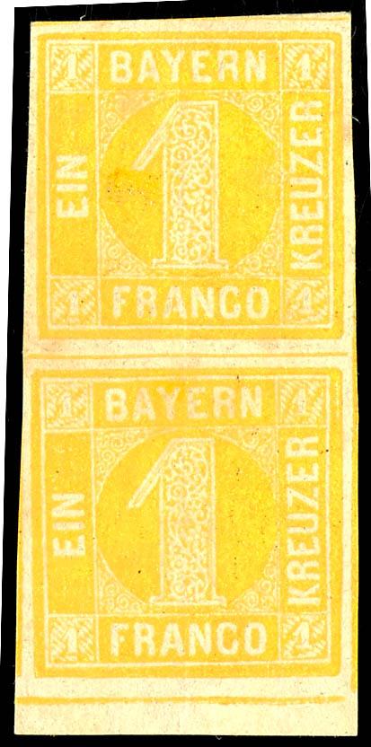 1 Kreuzer yellow, Type I, four-margined cut vertical cabinet pair, mint never hinged with original gum, photographic certificate Peter Sem BPP, Michel 250.- (8I(2)) Certificate 1 Kreuzer gelb, Type I, vollrandig geschnittenes senkrechtes Kabinettpaar, ungebraucht mit Originalgummierung, Fotobefund Peter Sem BPP, Mi. 250.- (Image)