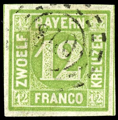 12 Kreuzer dark greenish-yellow, wide-margined cut square, fresh and in excellent condition, cancelled with an open wheel postmark, expertized HK (Horst Krause, Gelsenkirchen). (12) 12 Kreuzer dunkelgelbgrün, breitrandig geschnittenes und farbfrisches Kabinettstück, entwertet mit offenem Mühlradstempel, geprüft HK (Horst Krause, Gelsenkirchen) (Image)