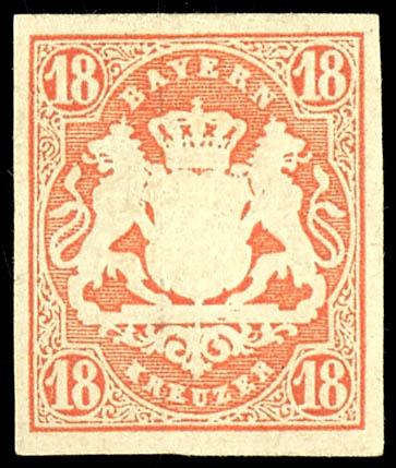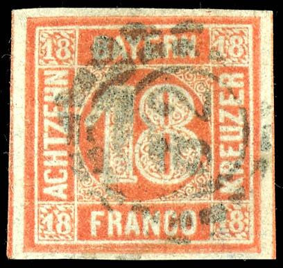 18 Kreuzer orange-red, a fine, mint never hinged example with full margins, cancelled with an open wheel stamp \32\ (Bamberg), photographic certificate from Franz Stegmueller BPP stating \flawless\, Michel 600.- (13b) Certificate 18 Kreuzer orangerot, vollrandiges und farbfrisches Kabinettstück, entwertet mit offenem Mühlradstempel \32\ (Bamberg), Fotobefund Franz Stegmüller BPP \einwandfrei\, Mi. 600.- (Image)