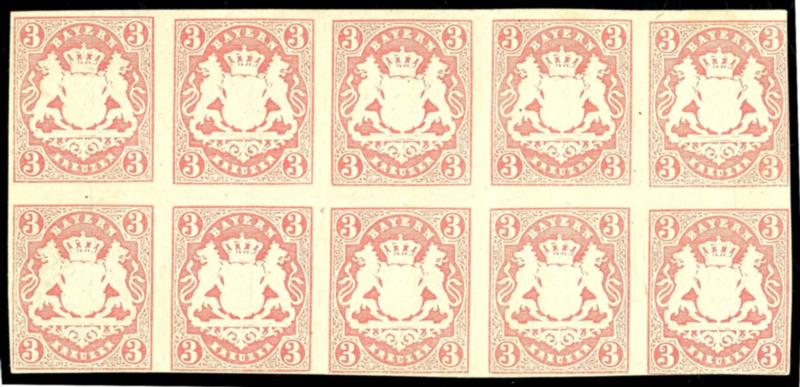 3 Kreuzer carmine, horizontal block of ten, mint never hinged with original gum - six values are truly mint, field 4, 5, 9 and 10 touched or with vertical crease, the other fields are flawless, photo certificate Peter Sem BPP \Larger units of this stamp are not common, as presumably no sheets were sold with the remaining stock.\ (15(10)) Certificate 3 Kreuzer karmin, waagerechter Zehnerblock, ungebraucht mit Originalgummierung - sechs Werte gar postfrisch, Feld 4, 5,9 und 10 berührt bzw. mit senkrechter Falte die anderen Felder tadellos, Fotoattest Peter Sem BPP \Größere Einheiten dieser Marke sind nicht häufig, da vermutlich keine Bogen mit dem Restbestand verkauft wurden.\ (Image)