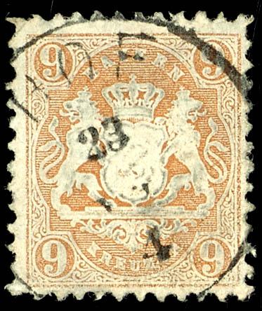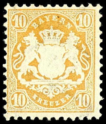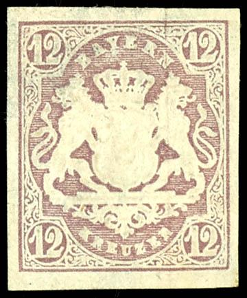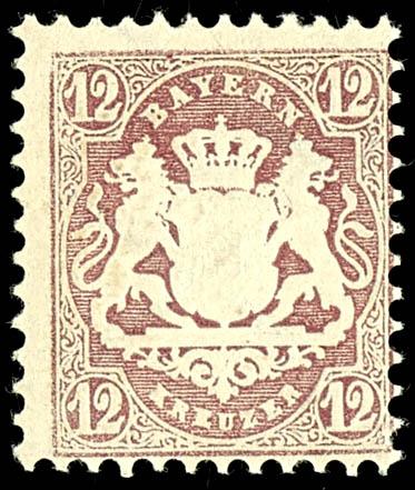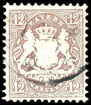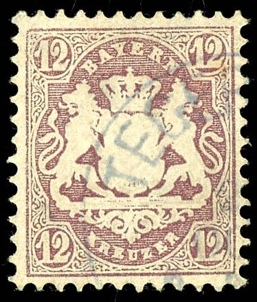 12 Kreuzer, 1870, brown-purple, Wz Y, \wide diamonds, 16 mm\, mint never hinged example, used with a blue-black circular postmark, \MUENCHEN...8 Nm\, photo certificate Steegmueller BPP (2019). \Slight inclusion in the center. The rare stamp is in excellent condition\, a particularly deeply colored stamp with the rare \Y\ watermark!, Michel 6. 000.- The slight inclusion is, in our opinion, acceptable for this rare stamp. (26Y) Certificate 12 Kreuzer, 1870 ,braunpurpur, Wz Y, \weite Rauten, 16 mm\, vollzähniges und farbfrisches Exemplar, gestempelt mit bläulichschwarzem Einkreisstempel, \MÜNCHEN...8Nm\, Fotoattest Steegmüller BPP (2019)\Unauffällige Hinterlegung in der Mitte. Die seltene Marke ist farbfrisch erhalten\, eine besonders farbtief erhaltene Marke mit dem seltenen \Y\-Wasserzeichen!\, Mi. 6.000.- Die kleine Hinterlegung, bei der seltenen Marke ist unserer Meinung nach akzeptabel. (Image)