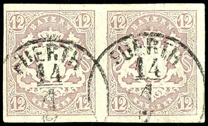 12 Kreuzer light brown violet, horizontal pair, fresh color and full margin cabinet piece, cancelled with a single circle postmark FUERTH 4 / 7, examined by Drahn. (18(2)) 12 Kreuzer hellbraunviolett, waagerechtes Paar, farbfrisches und vollrandiges Kabinettstück, entwertet mit Einkreisstempel FÜRTH 4/7, geprüft Drahn (Image)