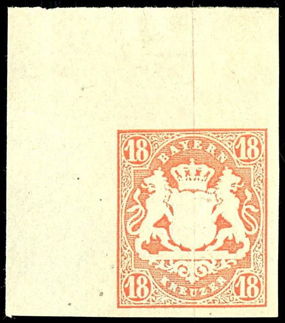 18 Kreuzer dark carmine red, full-margin and fresh example, corner margin piece upper left, mint never hinged with original gum, flawless condition, photographic finding by Peter Sem BPP \flawless\. (19) Certificate 18 Kreuzer dunkelzinnoberrot, vollrandiges und farbfrisches Kabinettstück, Eckrandstück links oben, ungebraucht mit Originalgummierung, tadellose Erhaltung, Fotobefund Peter Sem BPP \einwandfrei\ (Image)