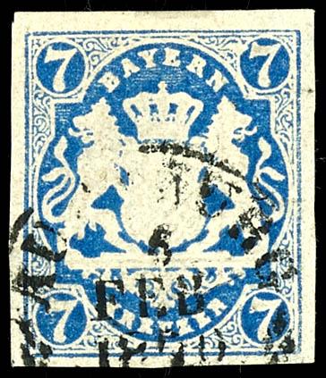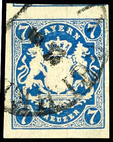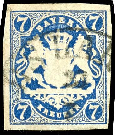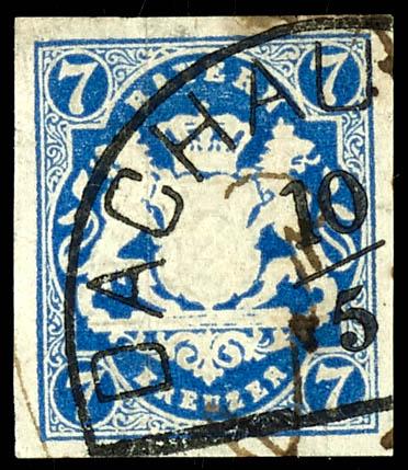 7 Kreuzer Prussian blue, fresh color and full margin cabinet piece, cancelled with a circular postmark DACHAU 10 / 5 and a weak pen stroke, photo certificate Maria Bretll AIEP \in fine, flawless condition.\ (21c) Certificate 7 Kreuzer preußischblau, farbfrisches und vollrandiges Kabinettstück, entwertet mit Halbkreisstempel DACHAU 10/5 und schwacher Federzug, Fotoattest Maria Brettl AIEP \in feiner, tadelloser Erhaltung.\ (Image)