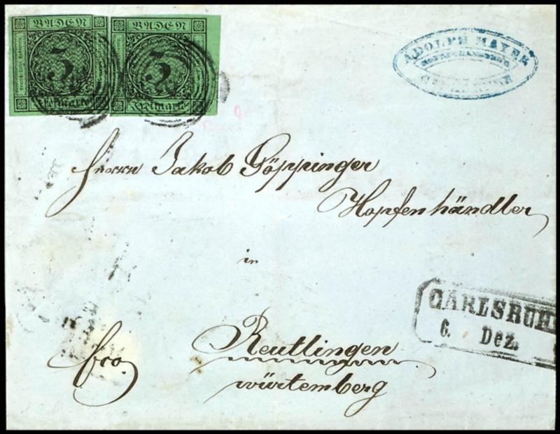 3 Kreuzer black on green, two values, one with a 3 mm margin on the right, on a postal franked letter front with a \24\ ring postmark and an additional mark \CARLSRUHE 6. December\ to Reutlingen / Wuerttemberg with arrival postmark, the margin piece is fully to over-margined on all sides and flawless, the other stamp is cut off at the top, with a small diagonal crease and a vertical archival fold, expertised Stegmueller BPP (6(2)) 3 Kreuzer schwarz auf grün, zwei Werte, einer mit 3 mm Bogenrand rechts, auf portogerechtem Faltbrief von Fünfringstempel \24\ und nebengesetztem Ra2 \CARLSRUHE 6. Dez.\ nach Reutlingen / Württemberg mit Ankunftsstempel, das Randstück allseits voll- bis überrandig und tadellos, die andere Marke oben angeschnitten, kleiner diagonaler Briefbug und vertikale Archivfaltung, gepr. Stegmüller BPP (Image)