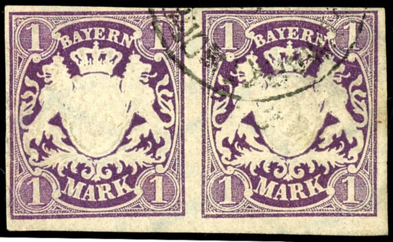 1 Mark dark violet, full to wide margins, used, cancelled with a partial strike of a one-circle postmark from \MARKT....... \, horizontal pair, small tear at the top between the stamps, very fresh color, flawless condition, photo certificate Maria Brettl AIEP (2024), Michel 700.- (30b) Certificate 1 Mark dunkelviolett, voll bis breitrandig, gestempelt, entwertet mit Teilabschlag eines Einkreisstempels von \MARKT.......\, waagrechtes Paar, kleiner Vortrennschnitt oben zwischen den Marken, sehr farbfrisch, tadellose Erhaltung, Fotoattest Maria Brettl AIEP (2024), Mi. 700.- (Image)