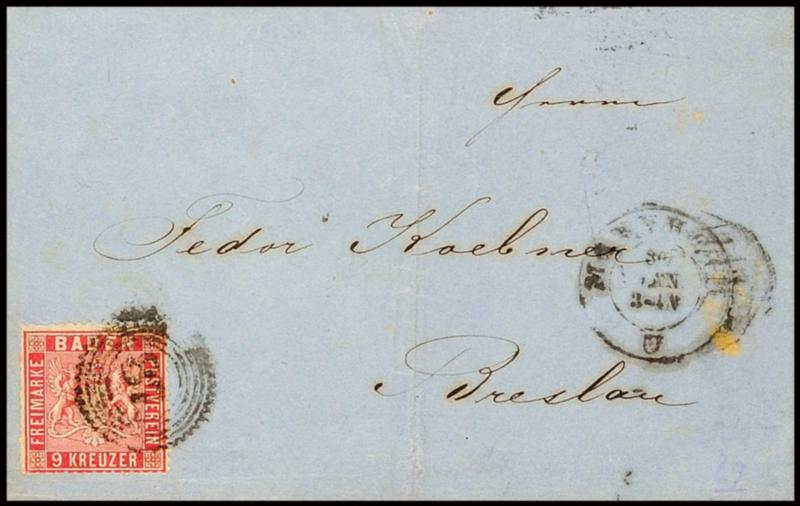 9 Kreuzer carmine, left with rough perforation, with circular date stamp \87\ on envelope from \MANNHEIM 30 JAN\ to Breslau with arrival postmark. (12) 9 Kreuzer karmin, links raue Zähnung, mit Zackenkranzstempel \87\ auf Briefhülle von \MANNHEIM 30 JAN\ nach Breslau mit Ankunftsstempel (Image)