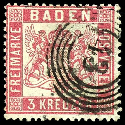 3 Kreuzer pink, complete and fresh-colored cabinet piece, clearly postmarked with the number stamp \43\ - Freiburg, photographic expert opinion by Wolfgang Flemming BPP, Michel 350.- (16) Certificate 3 Kreuzer rosa, vollzähniges und farbfrisches Kabinettstück, klar entwertet mit Nummernstempel \43\ - Freiburg, Fotobefund Wolfgang Flemming BPP, Mi. 350.- (Image)
