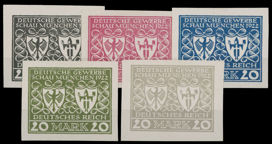 1922, Munich Trade Fair, set of five promotional Exhibition labels of 20m with design close to issued stamps, five different colors - dark brown, carmine rose, blue, olive green and pale gray, printed on glossy paper, no gum as produced, VF, Est. $150-$180 (Image)