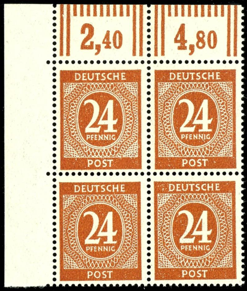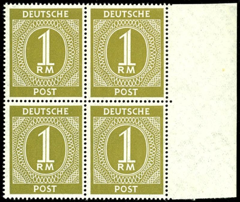 1 RM numeral brown olive, watermark increasingly, upper margin block of four, mint never hinged expertized Schlegel BPP, Michel 240,- (937Y(4)) (Image 1)(Image)