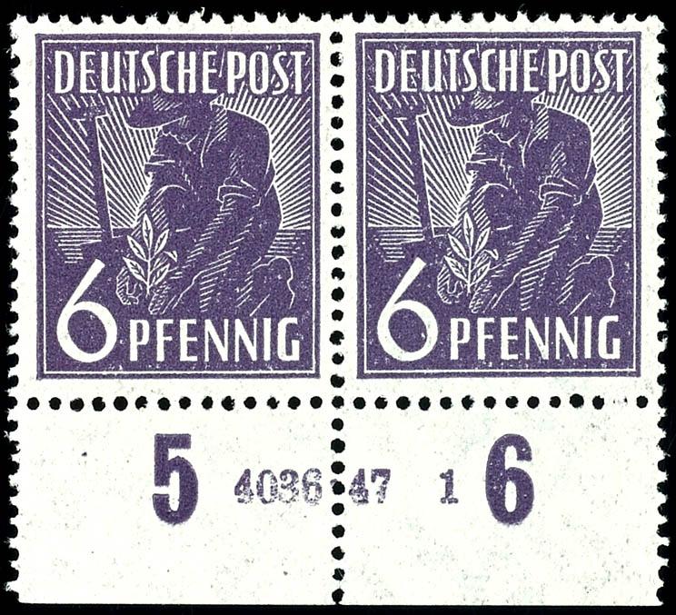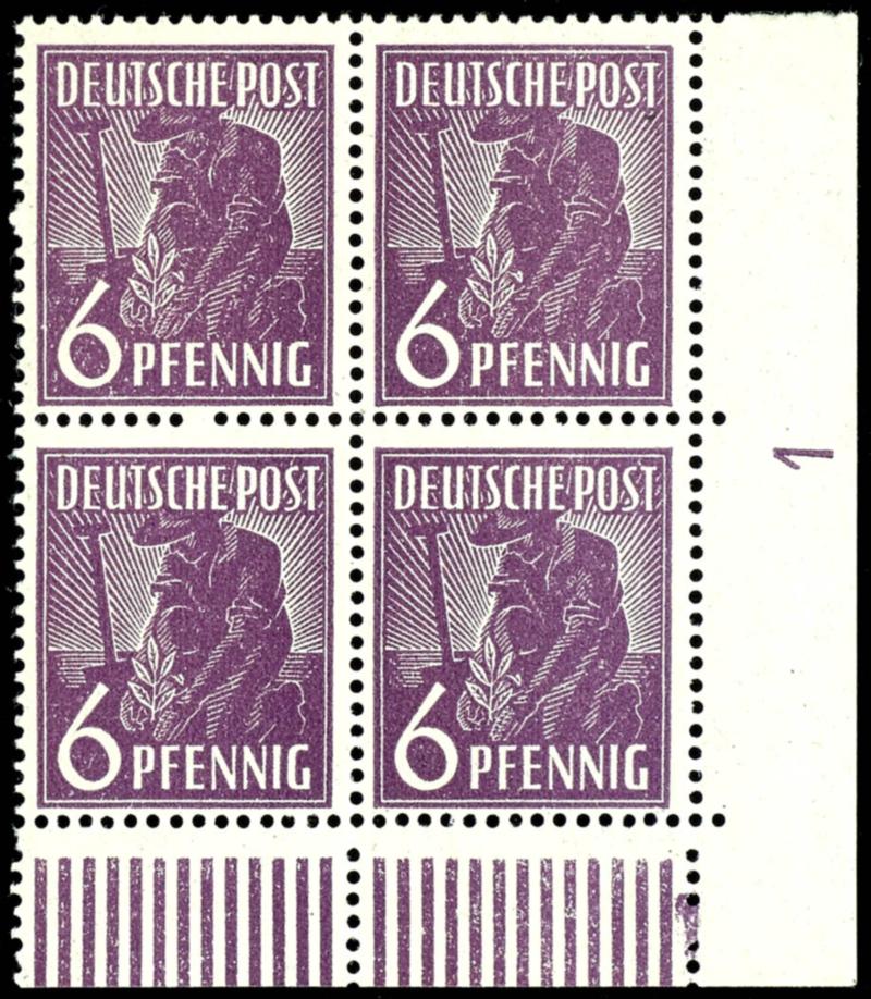6 Pfg. Worker violet, right lower block of four from the corner with printer signature \"1\" positive, besides field 100 above, mint never hinged, Michel 60,- (944DZ) (Image 1)(Image)