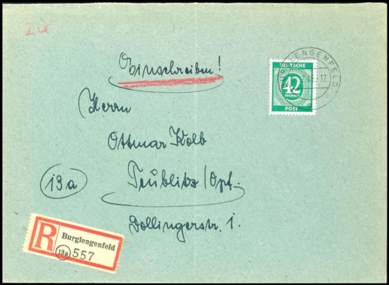 42 Pfg. Numerals, properly franked single franking on registered letter (folded) BURGLENGENFELD 28.2.46 to Teubleitz, Michel 350.- (930) (Image 1)(Image)