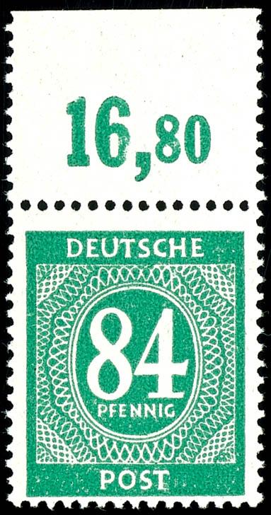 84 Pfg. Numerals dark green, upper margin copy perforations going through margins, mint never hinged, colour determination Bernhoeft, Michel 200.- (936aPOR) Certificate(Image 1)(Image)