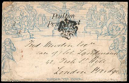 Great Britain, 1840, Mulready Envelope, 1d black & 2d blue with matched "Poulton Penny Post" markings.1d (slight soiling and corner faults) to London Bridge, canceled with "Poulton Penny Post" plus three red Maltese Cross Cancels, Preston and London backstamps, 2d (stereo A197, some soiling and corner restored) with matching origin and address, F.-V.F. appearance, a very rare matched pair, with 1979 R.P.S.L. certificates. Scott No. U1-U2; Estimate $750 - 1,000. US$750-1,000 (Image)