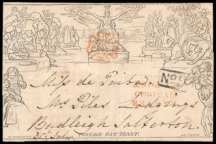 Great Britain, 1840, Mulready Letter Sheet, 1d black. With stereo unknown from Exeter to Budleigh Salterton; canceled with red Maltese Cross and matching "Exeter Py. Post JY 31, 1840" datestamp, boxed No.9 at lower right, backstamped "Exeter JY-31, 1840" cds, Extremely Fine and choice, a very attractive cover with great eye appeal. Scott No. U3; Estimate $200 - 300. US$200-300 (Image)