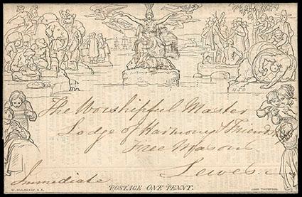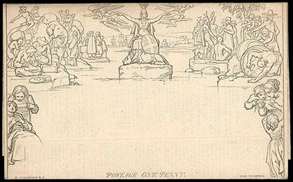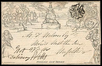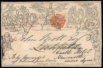 Great Britain, 1840, Mulready Letter Sheet, 1d black. Stereo unknown from Burton to Lichfield; canceled with bold red Maltese Cross, forwarded to Newcastle, backstamped with "J OC 28, 1840" cds; portion of sideflap missing, Very Fine appearing. Scott No. U3; Estimate $100 - 150. US$100-150 (Image)