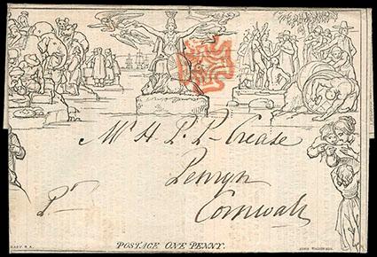 Great Britain, 1840, Mulready Advertising Letter Sheet, 1d black. With stereo number A35, canceled with bold red Maltese cross, from London to Ruffelsquare blue "T,P. Charles St West" cancel at right, overall advertising on back headed TO ADVERTISERS. Guaranteed Circulation 5000 stamped copies,-Total Number of Stamps Issued in June and July. 55,000!!! printed in blue (S.G. Spec. MA5a); small sealed tear at top, otherwise Very Fine, a very scarce advertisement on reverse. Scott No. U3; Estimate $200 - 300. US$200-300 (Image)